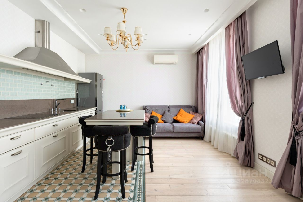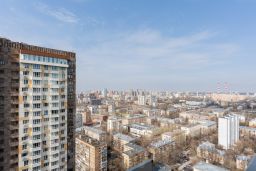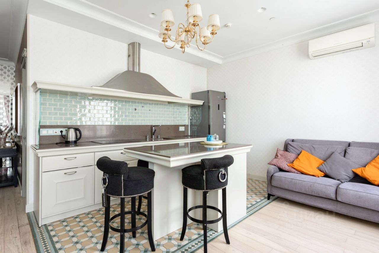Итальянский кухонный гарнитур, столешница и подоконники из натурального камня, вся техника Miele, на полу паркетная доска, мебель сделана на заказ. Все для комфортного проживания: кондиционер, теплый пол. Из окон открывается прекрасный панорамный вид на Москву.