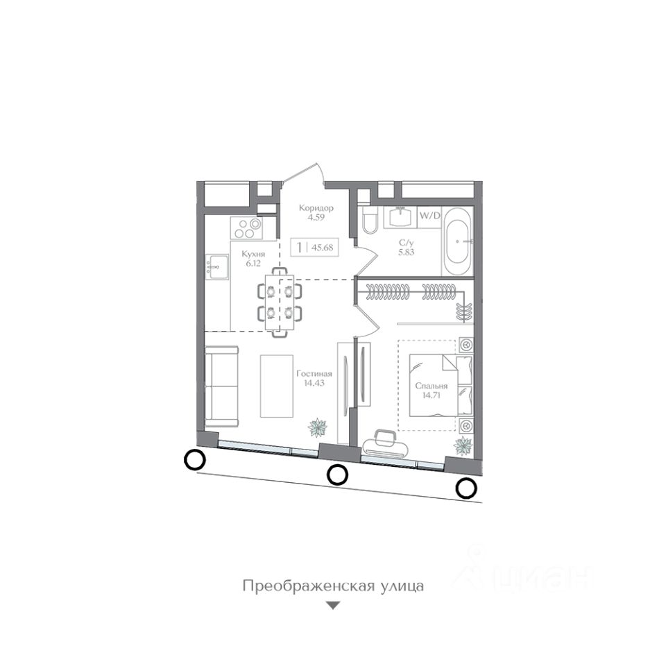 Общая площадь45,68 м²