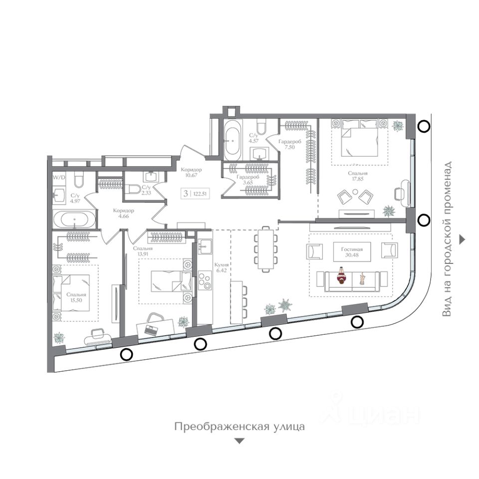 Комплекс расположен на первой линии от метро "Преображенская площадь" в историческом районе с развитой инфраструктурой. Удобный выезд позволяет добраться до ТТК всего за 7 минут, до Садового кольца — за 8 минут.