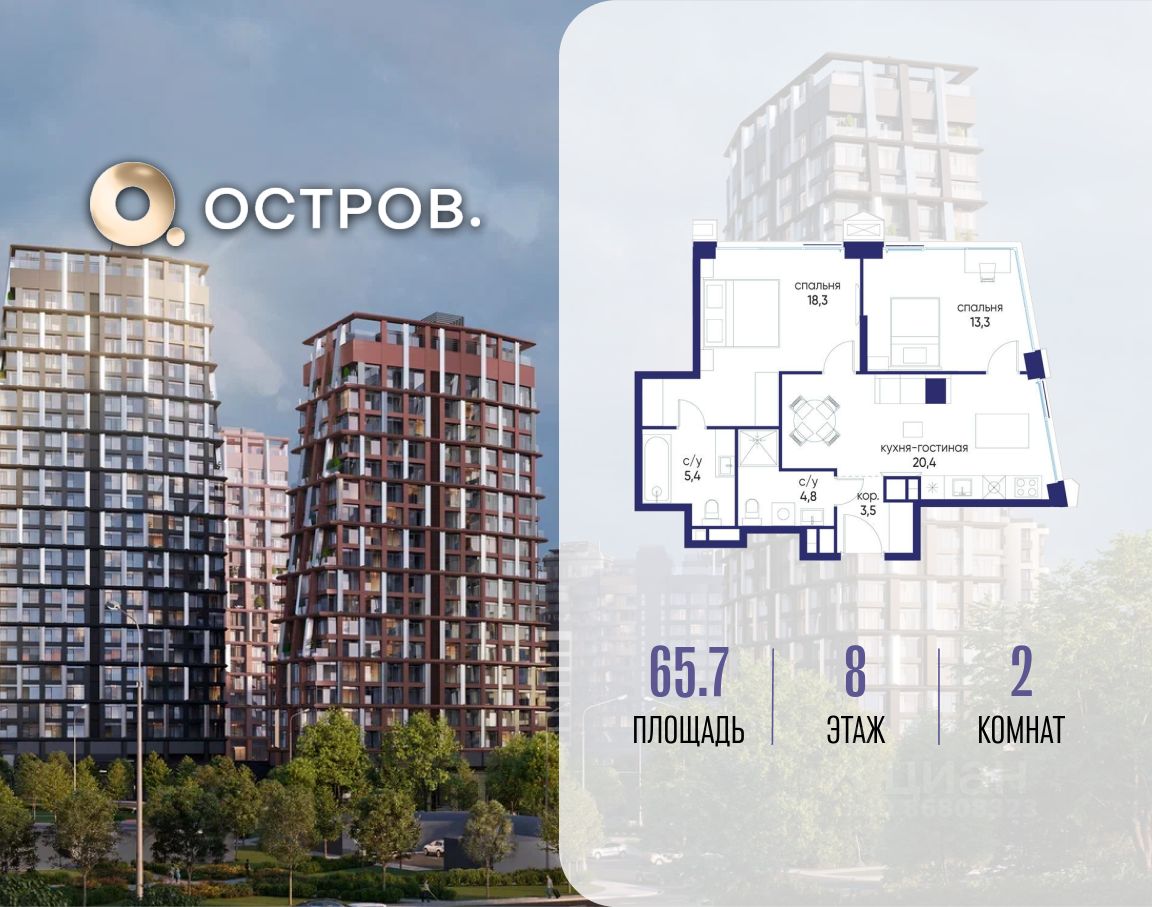 Продаётся 2-комн. квартира от застройщика: общая площадь 65.70 м², жилая 31.60 м², кухня 20.40 м², 8-й этаж, жилой квартал "Остров 14", корпус 6 (секция 1). Срок сдачи: 2 квартал 2029 года.