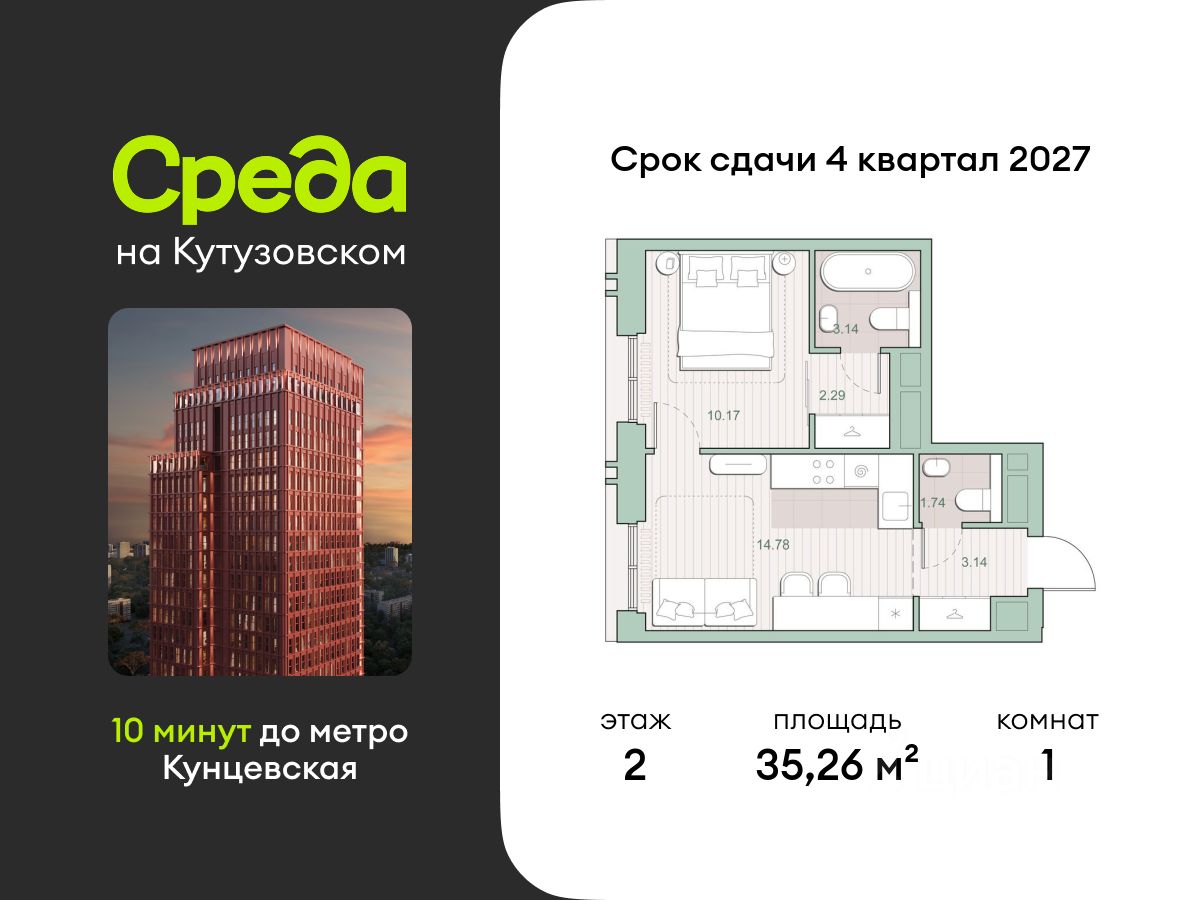 Продаётся однокомнатная квартира общей площадью 35.26 кв. м. с отделкой на выбор: черновая, White Box. Квартира на 2 этаже корпуса 5 в жилом комплексе бизнес-класса "Среда на Кутузовском". До метро "Кунцевская" 10 минут пешком.