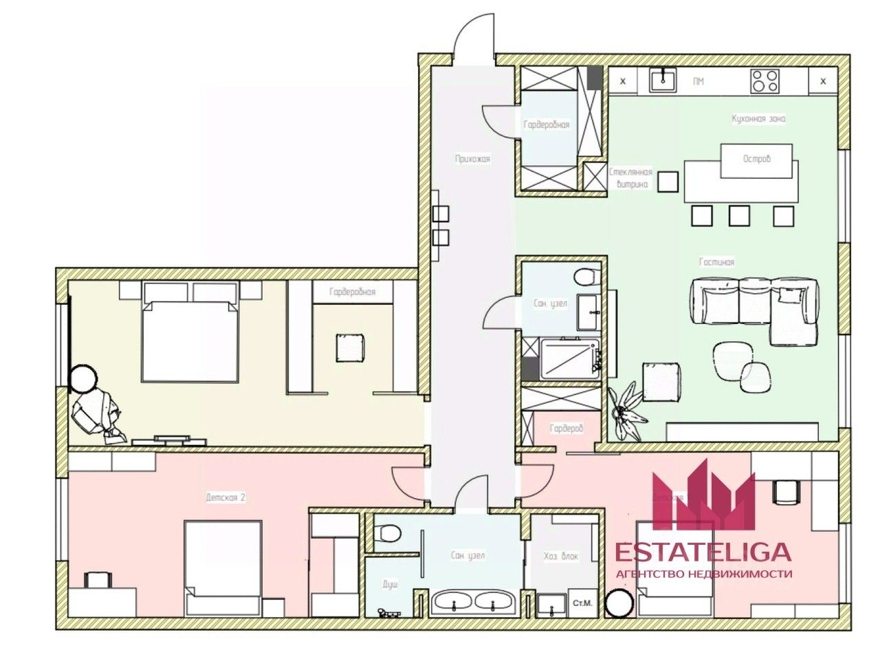 - Планировка с возможностью устройства трех гардеробных комнат или двух гардеробных с постирочной.