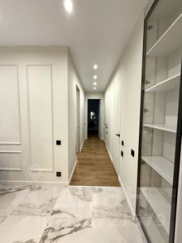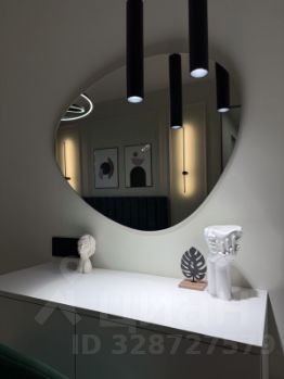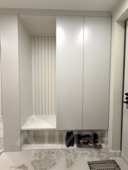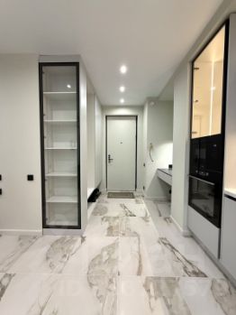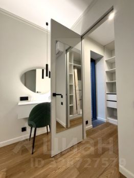 При входе в квартиру можно сразу разместить свои вещи в большом шкафе-купе, а слева установлено зеркало с подсветкой и небольшие полки для хранения мелких предметов.