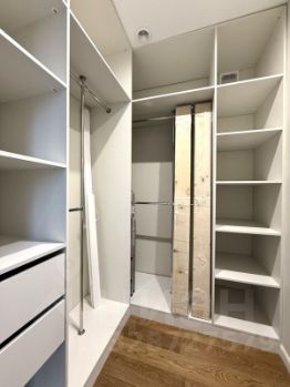 По коридору справа расположена гардеробная с выводами под стиральную и сушильную машинки. Санузел с ванной, отдельно есть шкафчик для хранения и выступ над ванной, где удобно разместить принадлежности.