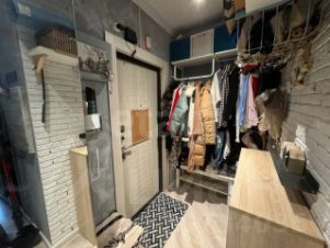 В прихожей зеркальные просторные шкафы из массива дерева, системы хранения Икеа для верхней одежды.