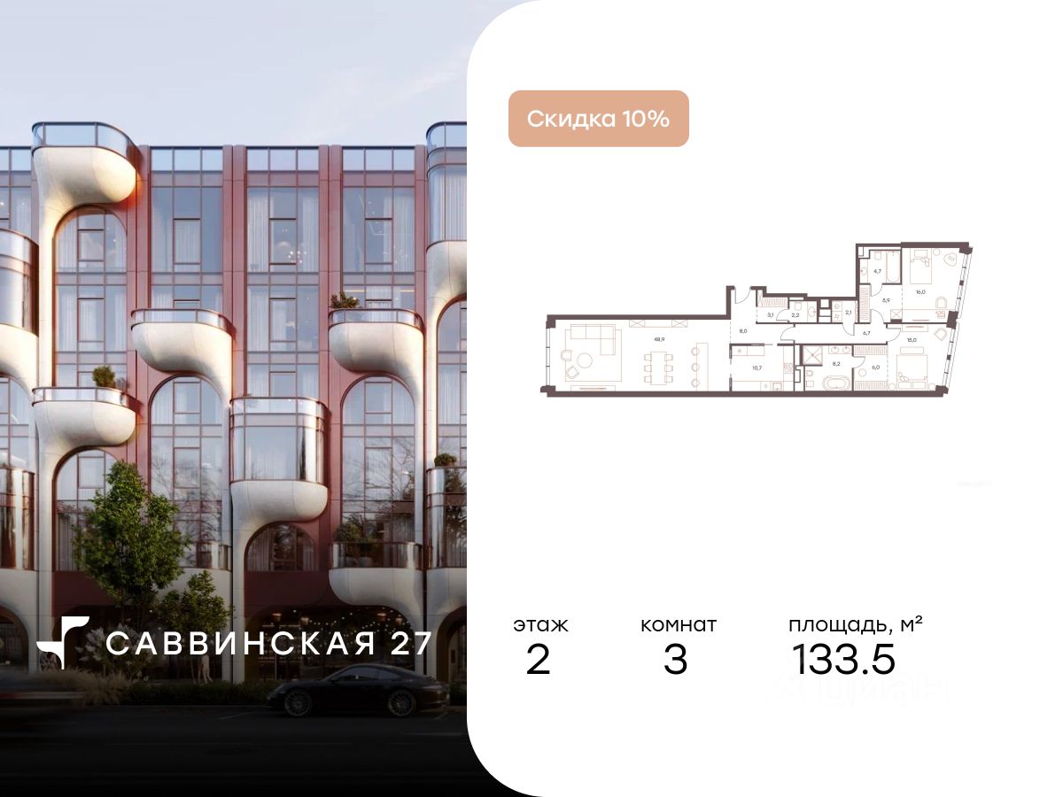 В историческом районе Хамовники продаются 3-к апартаменты площадью 133.50 кв.м, расположенные на 2 этаже делюкс-резиденции Саввинская 27.