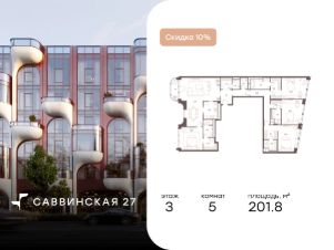В историческом районе Хамовники продаются 5-к апартаменты площадью 201.80 кв.м, расположенные на 3 этаже делюкс-резиденции Саввинская 27.