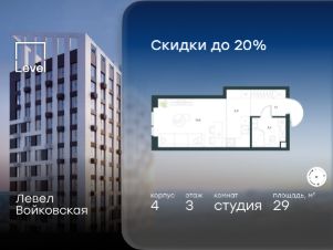 Продается студия площадью 29.00 кв. м с отделкой. Квартира находится на 3 этаже 26-этажного корпуса 4, в новом жилом комплексе бизнес-класса Левел Войковская, расположенном рядом с живописным заповедником "Покровское-Стрешнево" (застройщик - компания Level Group/Левел групп).