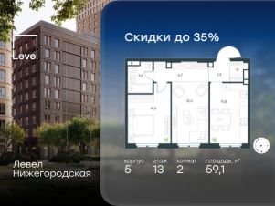 В активно развивающемся районе на юго-востоке столицы продается 2-комнатная квартира площадью 59,1 кв.м c предчистовой отделкой. Квартира расположена на 13 этаже 29-этажного этажного корпуса 5 в жилом комплексе комфорт-класса Левел Нижегородская (компания Level Group/Левел групп).