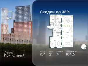В готовом жилом комплексе на набережной Москвы-реки продается 4-комнатная квартира площадью 104,6 кв.м без отделки. Квартира расположена на 21 этаже 32 этажного корпуса " Юг" в жилом комплексе бизнес-класса Левел Причальный (компания Level Group/Левел групп).