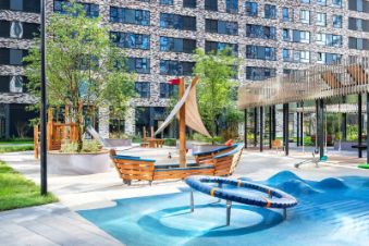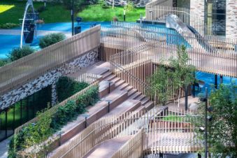 Верхний и нижний уровни двора соединяет 90-метровый мост-пергола. Дети смогут спускаться с него по горкам, будто ныряя в пучину океана.