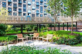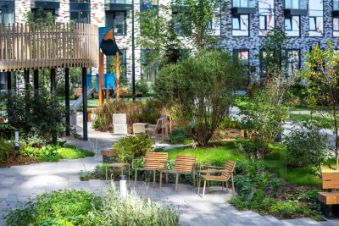 Дизайн внутренней территории жилого комплекса Левел Причальный разработан совместно со студией UpLand. Это уникальный двухуровневый двор с пространством для жителей любого возраста.