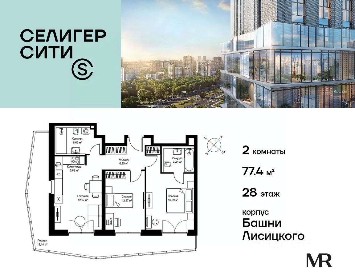 Продаётся 2-комнатная квартира общей площадью 77.41 м² без отделки в ЖК "Селигер Сити" на 28-м этаже башни Лисицкого.