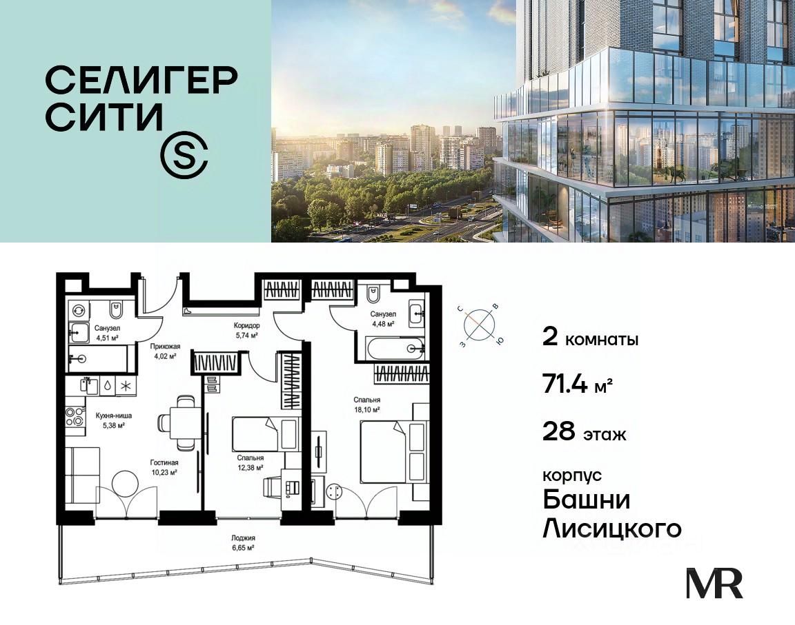 Продаётся 2-комнатная квартира общей площадью 71.49 м² без отделки в ЖК "Селигер Сити" на 28-м этаже башни Лисицкого.