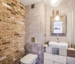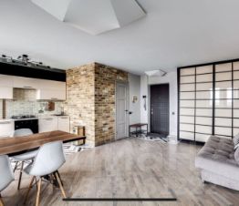 венецианского микроцемента и натурального бельгийского кирпича ручной работы. Пол дубовый, подоконники и кухня из искусственного камня Samsung.