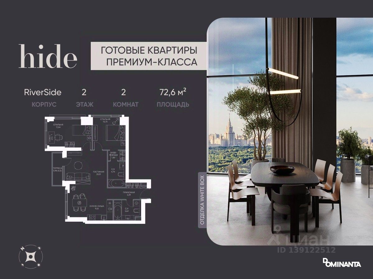 Прямая продажа от застройщика! Дом сдан, ключи в день покупки. Предлагается просторная 3-комнатная квартира 72.6 м² с отделкой white box на 2 этаже в проекте hide — жилом небоскребе премиум-класса от Dominanta и MR. ТОП-ВИДЫ НА 360: Воробьевы горы, Москва-Сити, Лужники, центр, МГУ, Парк Победы. ПРЕСТИЖНАЯ ЛОКАЦИЯ: Расположение на границе районов Раменки и Хамовники: быстро до ТТК, Москва-Сити, а рядом природа — Воробьевы горы и заказники Долины реки Сетунь. КОМФОРТ НОВОГО УРОВНЯ: панорамное остекление, "Умный дом", продуманная планировка евроформата. LIFE SPACE ДЛЯ РЕЗИДЕНТОВ: видовая терраса, хоум-офис, фитнес зал, бьюти-кабинет, общественная гостиная. Более 50% двора — ландшафтный парк с холмами и "парящими" мостами. СПЕЦИАЛЬНОЕ ПРЕДЛОЖЕНИЕ: скидка 10% при полной оплате и ипотеке без субсидий — действует до 30.04.2026. Не упустите шанс!*Стоимость в объявлении указана со скидкой.