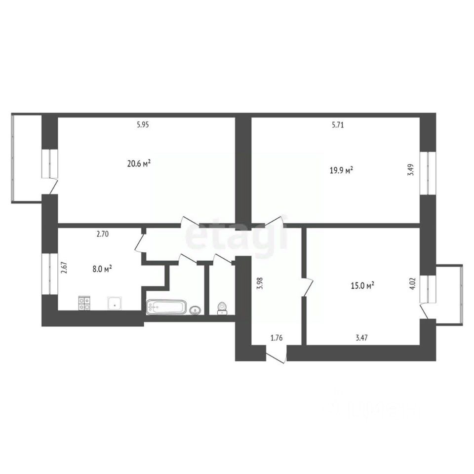 Окна и балконы на обе стороны дома. Одна несущая стена — широкие возможности для перепланировки. Перекрытия железобетонные. Высота потолков 3,3 м.