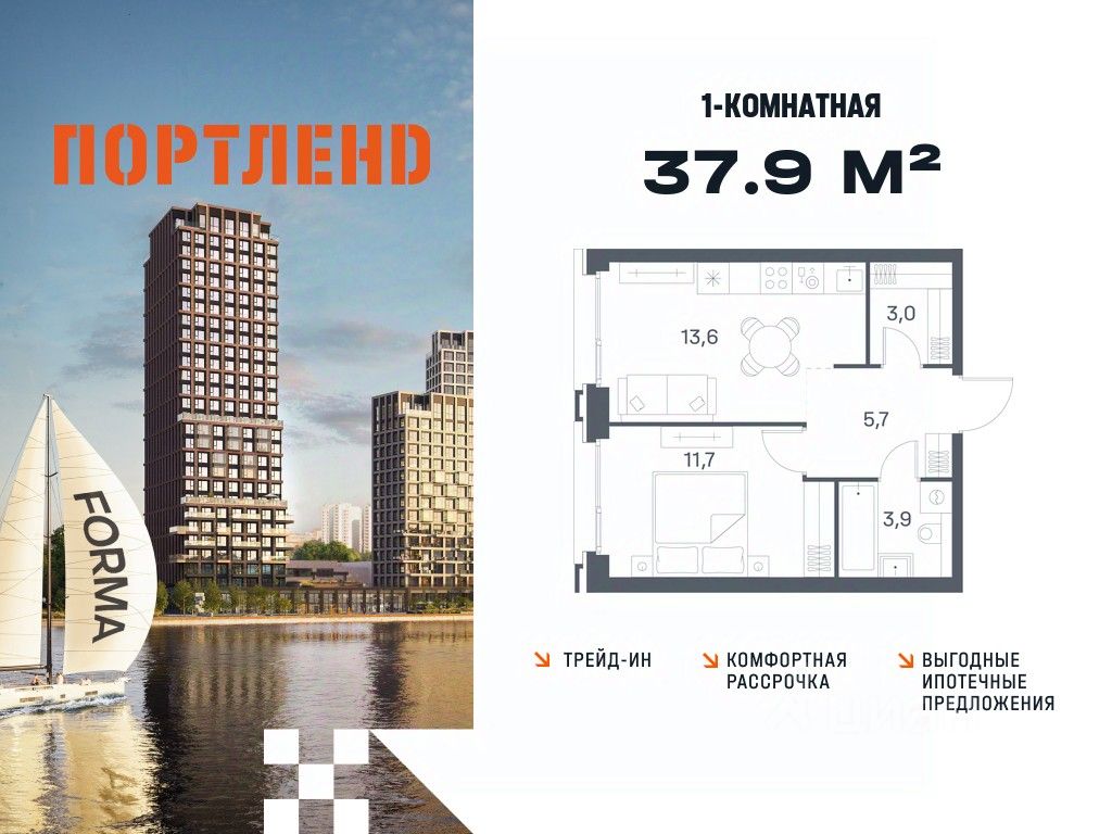 Продаётся 1-к. квартира, 24 этаж в жилом комплексе бизнес-класса ПОРТЛЕНД от девелопера FORMA. ЖК расположен на берегу Москвы-реки в северной части района Печатники в акватории Южного речного порта.