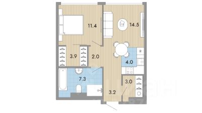 Функциональная планировка включает: прихожую с гардеробной и большим санузлом (7,3 м2), кухню-гостиную (18,5 м2) и спальню с гардеробной (11,4 м2 + 3,9 м2).