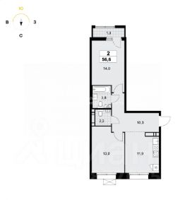 Общая площадь: 56,6 кв.м.