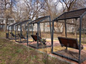 Большой зеленый двор с большим количеством интерактивных площадок для детей разного возраста и взрослых.