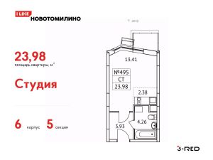 Продается студия общей площадью 23,98 кв.м. на 2 этаже 17-этажного дома. Квартира расположена в стильном жилом комплексе "Новотомилино" от застройщика 3-RED. Удобная и практичная планировка дарит максимально широкие возможности для создания интерьера и позволит рационально использовать каждый сантиметр.