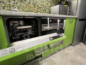 Просторная обустроенная кухня с дорогим кухонным гарнитуром и новой встроенной немецкой бытовой техникой: