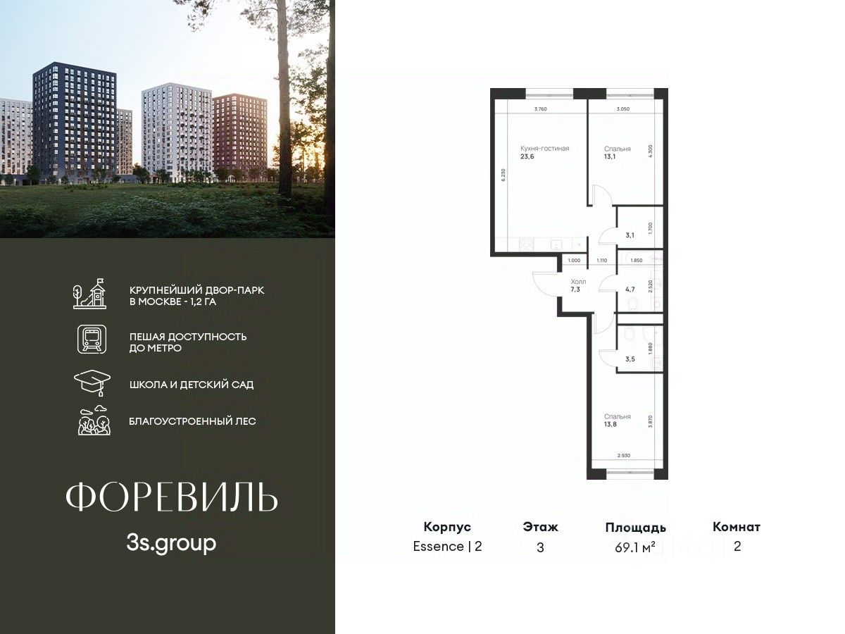 Предчистовая отделка в подарок! Пешая доступность от метро и московская прописка! Продается уютная 2-комн. квартира площадью 69,1 кв.м на 3 этаже 17 этажного жилого комплекса бизнес-класса Foreville от 3S Group.