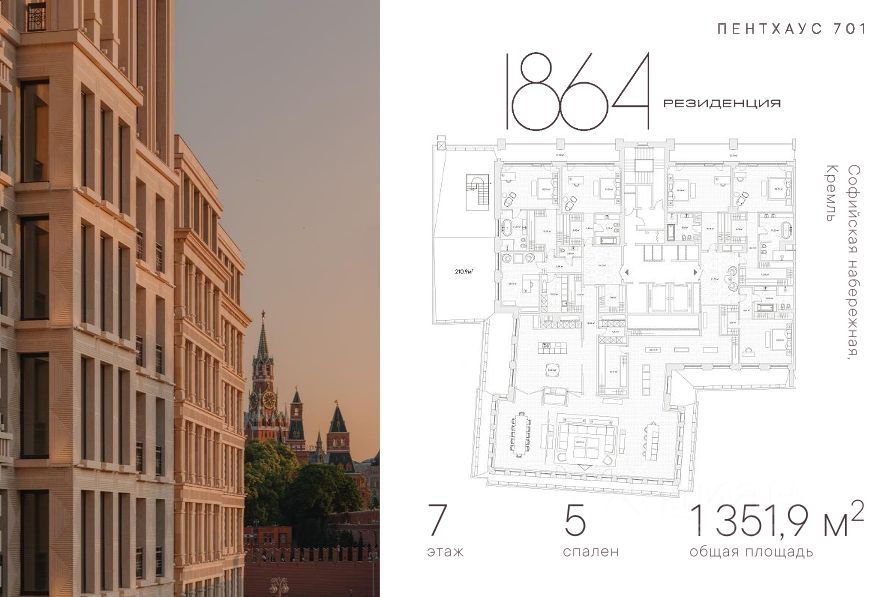 Просторный пентхаус площадью 793,5 кв. м с панорамной террасой занимает 7-й этаж комплекса коллекционных апартаментов "Резиденция 1864", предлагая эксклюзивные виды на исторический центр Москвы. Здесь царит атмосфера абсолютной свободы и света благодаря большим помещениям с окнами в пол, а для полной приватности предусмотрены отдельные входы и лифты для владельца и обслуживающего персонала.