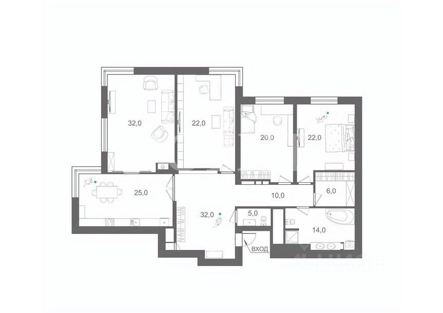 Функциональная планировка: гостиная с декоративным каминов 32 кв.м., просторная кухня 25 кв.м., три спальни (20 и 22 кв.м.), гардеробная, совмещенный санузел, гостевой санузел, прихожая 32 кв.м.