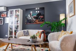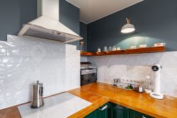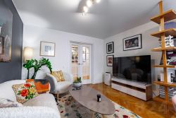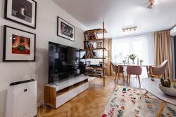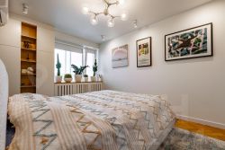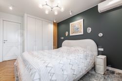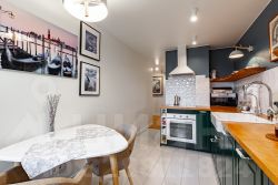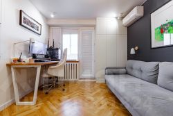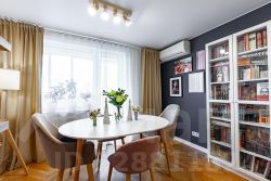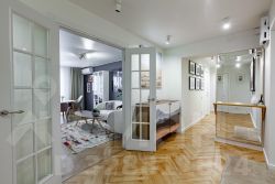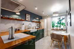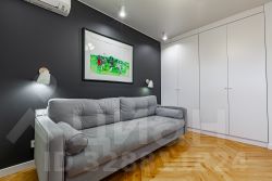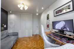 Весь кухонный блок остается в квартире (настенные полки и подоконник из массива карагача). Из квартиры вывозится только мягкая мебель, все остальное может быть оставлено, в том числе, часть техники. В каждой из жилых комнат есть выводы для установки кондиционеров.