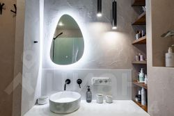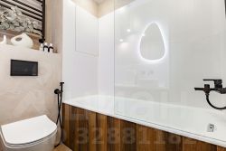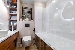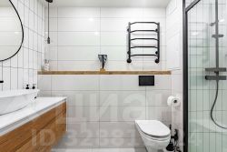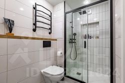 Стены под покраску и выведены 90 градусов. Напольное покрытие: инженерная доска и паркет в гостиной. Санузлы — плитка и декоративная штукатурка. Отличные встроенные шкафы в жилых комнатах и коридоре, где включен постирочный блок под вертикальную установку сушильной и стиральной машин. Материалы: мдф + фасады Egger. В квартире есть два совмещенных санузла: в одном — ванна, а во втором — душевая.