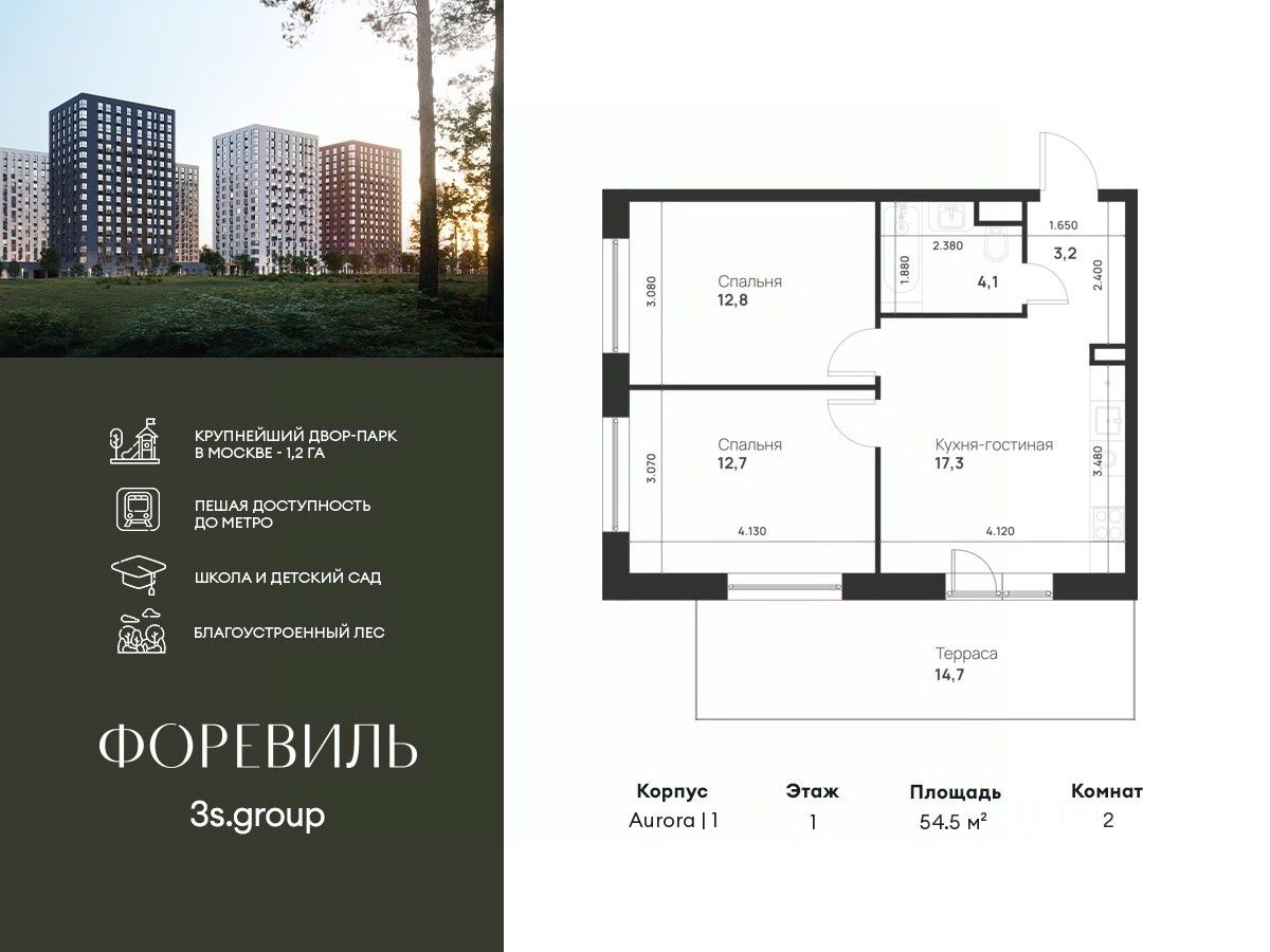 Продается уютная 2-комн. квартира площадью 54,5 кв.м на 1 этаже 17 этажного жилого комплекса бизнес-класса Foreville от 3S Group.