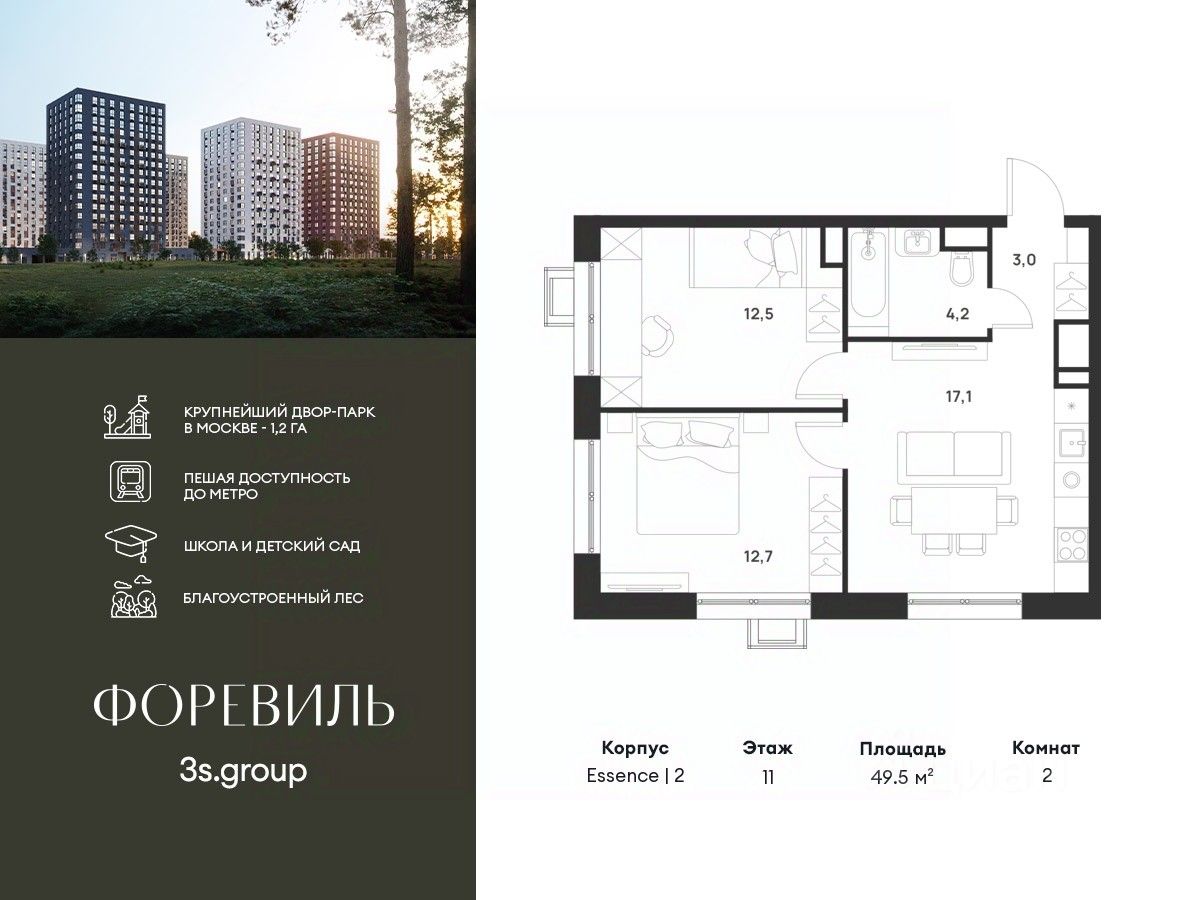Предчистовая отделка в подарок! Пешая доступность от метро и московская прописка! Продается уютная 2-комн. квартира площадью 49,5 кв.м на 11 этаже 17 этажного жилого комплекса бизнес-класса Foreville от 3S Group.