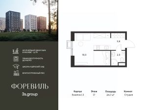 Предчистовая отделка в подарок! Пешая доступность от метро и московская прописка! Продается уютная студия площадью 24,7 кв.м на 17 этаже 17 этажного жилого комплекса бизнес-класса Foreville от 3S Group.