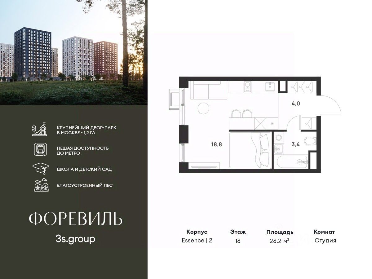 Предчистовая отделка в подарок! Пешая доступность от метро и московская прописка! Продается уютная 1-комн. квартира площадью 26,2 кв.м на 16 этаже 17 этажного жилого комплекса бизнес-класса Foreville от 3S Group.