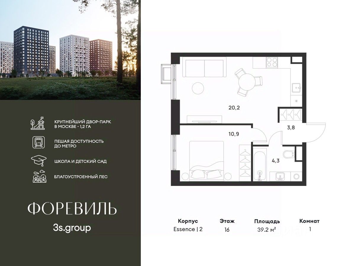 Предчистовая отделка в подарок! Пешая доступность от метро и московская прописка! Продается уютная 1-комн. квартира площадью 39,2 кв.м на 16 этаже 17 этажного жилого комплекса бизнес-класса Foreville от 3S Group.