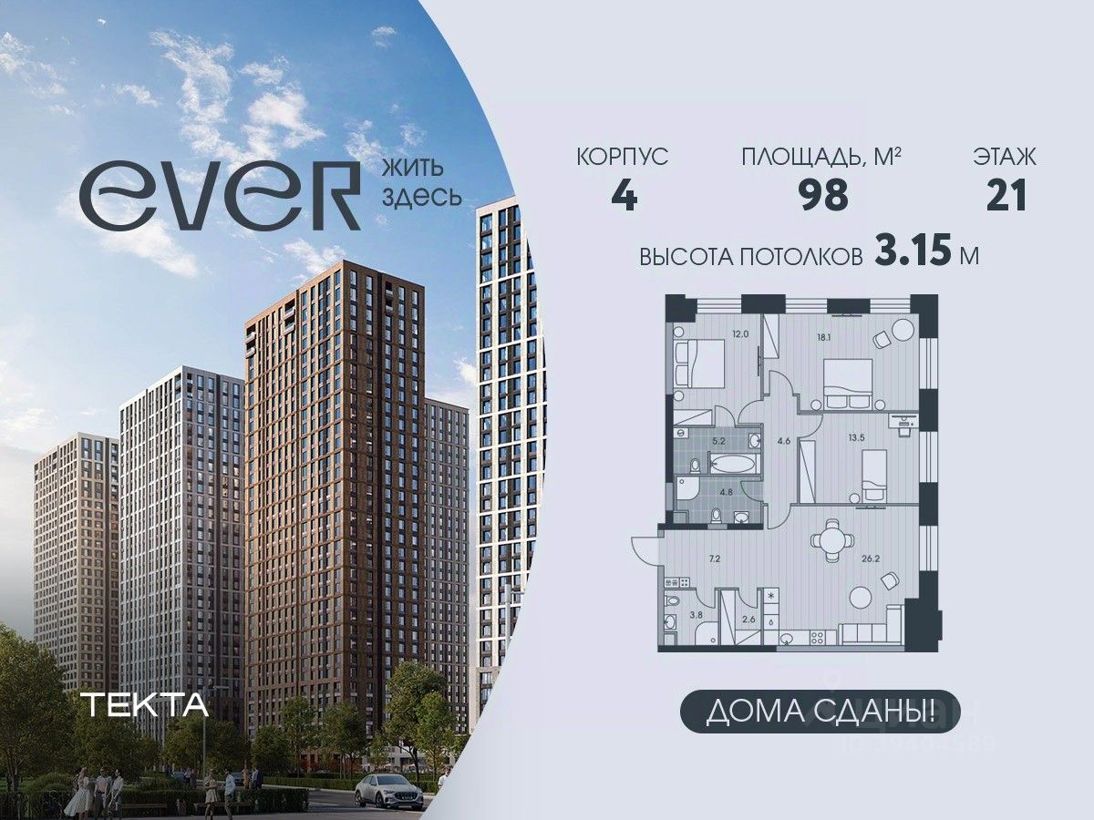 4-комн. квартира в ЖК "Ever" на 21 этаже в 34 этажном здании Корпус 4. Общая площадь: 98 кв.м., жилая: 61.6 кв.м. Высота потолков 3.15 м.