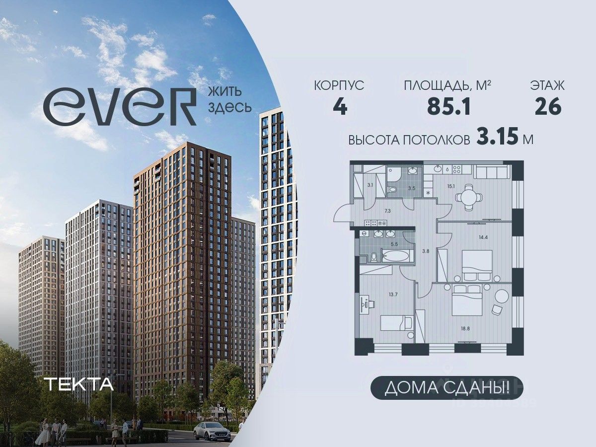 3-комн. квартира в ЖК "Ever" на 26 этаже в 34 этажном здании Корпус 4. Общая площадь: 85.1 кв.м., жилая: 46.9 кв.м. Высота потолков 3.15 м.
