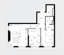 Квартира с Готовой улучшенной отделкой и функциональной планировкой углового типа: Изолированные комнаты - 11,1 + 10,7 кв.м Просторная кухня - гостиная - 20,5 кв.м. Два совмещенных санузла. Просторный холл - 4,5 кв.м с местом под гардеробную зону.
