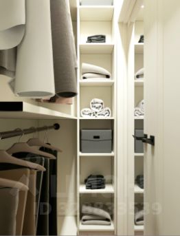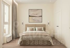 - В спальне: кровать, две подвесные тумбочки, подвесная тумба, консольная тумба, выполнены по индивидуальному проекту, зеркало, мягкий стул, телевизор, шторы,