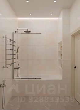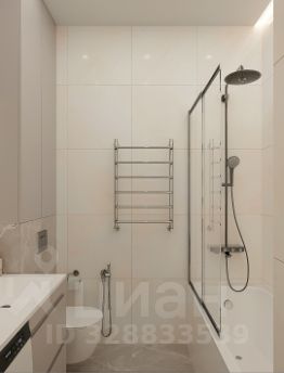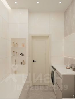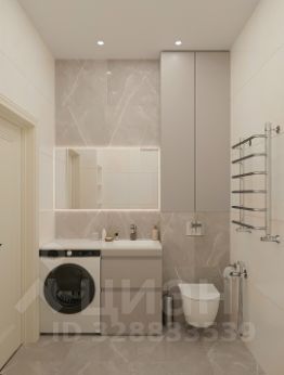 - В Ванной комнате: акриловая ванна, душевая система, гигиенический душ, смесители, стеклянная шторка на ванну, зеркало с подсветкой, тумба со встроенной раковиной, подвесной унитаз, дверки над коробом с инсталляцией, проточный обогреватель, стиральная машина.