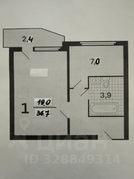 Планировка: общая площадь с балконом 39,1 кв.м., без балкона 36,7 кв.м.; комната 19,0 кв.м. с балконом 2,4 кв.м.; кухня 7 кв.м.. Пол - ламинат, плитка.