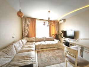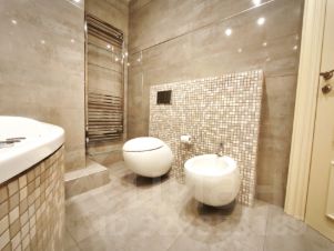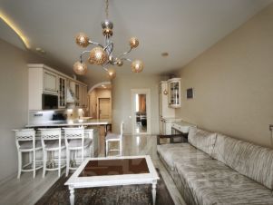 Квартира укомплектована всей необходимой для проживания мебелью что позволяет сразу начать комфортное проживание, без лишних затрат. Установлен кухонный гарнитур со встроенной современной техникой, в санузлах установлена сантехника от ведущих европейских производителей. Стены окрашены по специальной технологии в светлых тонах, на полу паркет и плитка, потолки выровнены и окрашены. В зоне плитки на кухне, прихожей и санузлах уложен теплый пол. Освещение люстры и споты.