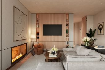 Интерьер создан 1508 London — британским бюро, чьи проекты украшают резиденции по всему миру. В этой квартире всё говорит о сдержанной роскоши: тёплый оттенок дубовой инженерной доски с уникальной раскладкой, текстильные обои и панели из натурального шпона на стенах; дровяной камин как центр гостиной; итальянская кухня Boffi, исполненная по индивидуальному со встроенной техникой Gaggenau; ванная как личное спа: натуральный мрамор, сантехника Antonio Lupi / CEA, баланс текстур и света.
