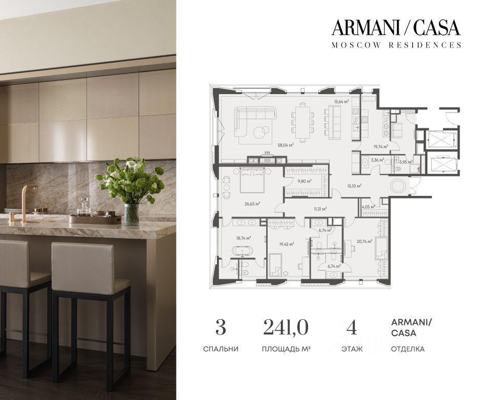 Последние лоты в продаже! КВАРТИРЫ ГОТОВЫ К ПРОЖИВАНИЮ Armani / Casa Moscow Residences — первый и единственный в России проект, созданный в партнерстве с легендарным итальянским домом Armani. Это не просто жилье, а произведение искусства, где каждая деталь отражает безупречный вкус и изысканность итальянского стиля. Комплекс расположился в самом аутентичном историческом районе Москвы — Якиманке. Эта локация известна как "Золотой треугольник искусств": всего в нескольких шагах находятся Третьяковская галерея, Дом культуры ГЭС-2 и новое здание Третьяковки. Всего 26 резиденций в доме создают особую атмосферу приватности и камерности. Это самый камерный проект в Замоскворечье, где каждый житель сможет насладиться тишиной и уютом, вдали от городской суеты. Архитектура создана знаменитым британским бюро John McAslan + Partners. Фасад из натурального камня и элементы из анодированной латуни создают неповторимый облик, гармонично вписывающийся в исторический контекст района. Эксклюзивный дизайн интерьеров от Armani/Casa, премиальные кухни с техникой Gaggenau, сантехника Armani/Roca, инженерная доска из дуба, итальянский мрамор в отделке и дровяные камины с порталами из мрамора создают атмосферу истинной роскоши. Комплекс оснащен всем необходимым для роскошной жизни: фитнес-центр с оборудованием Technogym, спа-зона с хаммамом, детская игровая комната, собственная кофейня и винный бутик, подземный паркинг с прямым доступом к лифтам. Профессиональное управление комплексом обеспечивает безупречный сервис на высшем уровне. Отдельные сервисные лифты для персонала гарантируют комфортное разделение потоков движения. Круглосуточный консьерж-сервис берет на себя все заботы резидентов, обеспечивая максимальный комфорт проживания. Квартиры готовы к переезду! Доступна беспроцентная рассрочка на 1 год