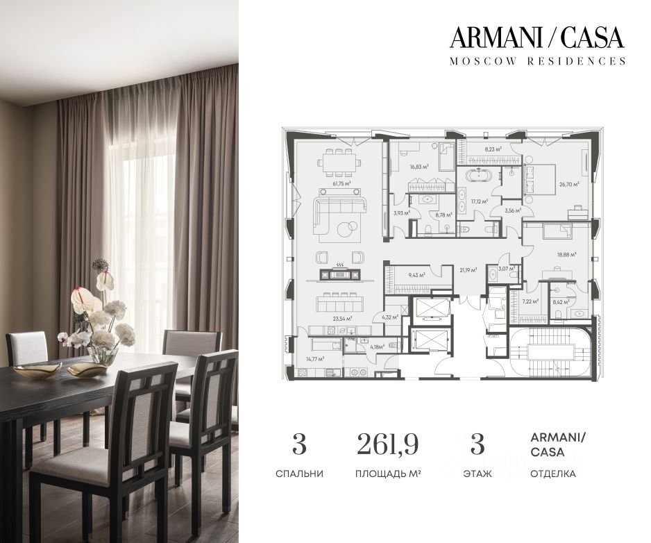 Armani / Casa Moscow Residences — первый и единственный в России проект, созданный в партнерстве с легендарным итальянским домом Armani. Это не просто жилье, а произведение искусства, где каждая деталь отражает безупречный вкус и изысканность итальянского стиля.