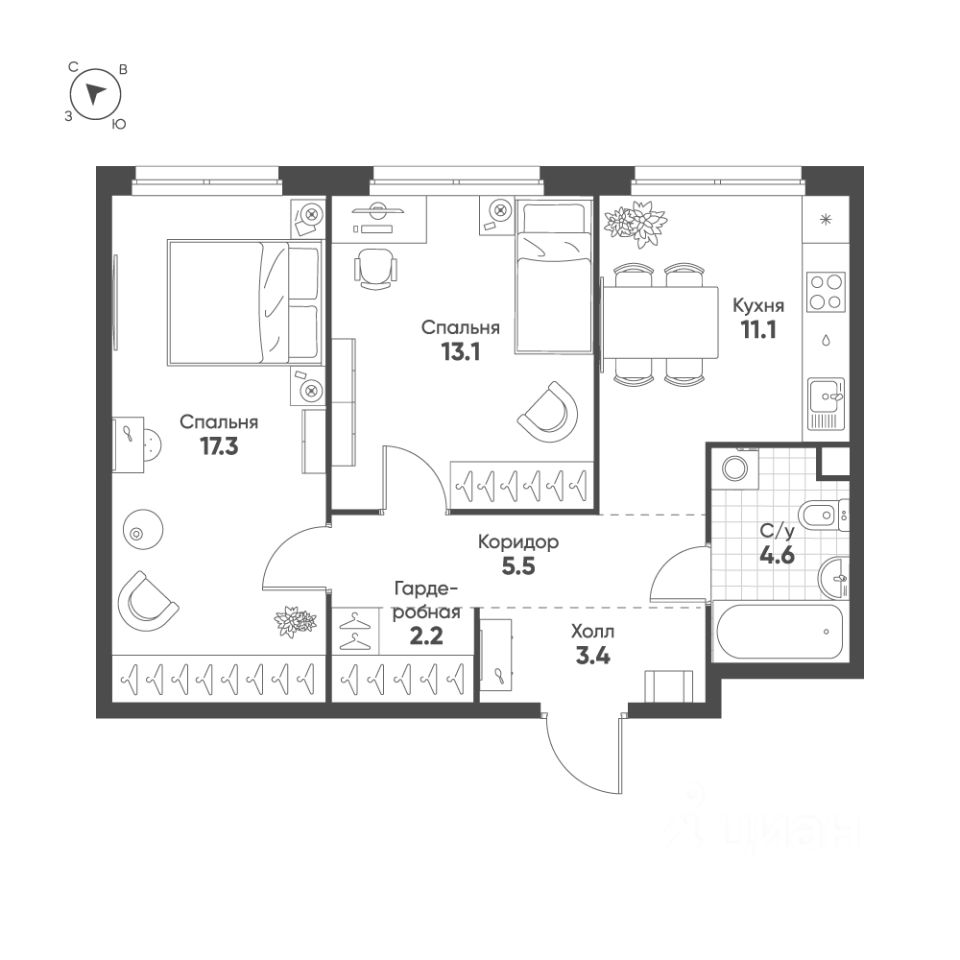 Продаётся 2-комнатная квартира в строящемся доме (Корпус 2.1 (3 очередь, 2 этап)), срок сдачи: II-кв. 2028, общей площадью 57.2 кв.м., на 2 этаже. Это город в городе, который не подстраивается под старые рамки, а задает новую планку и стандарт жилого района в России.