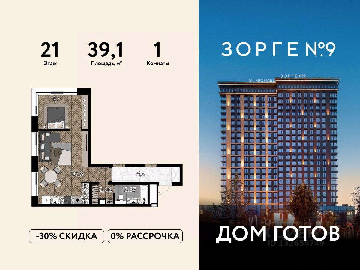 "Зорге 9" — готовые апартаменты бизнес-класса на Ходынке. 10 минут до Москва-Сити. Архитектура: 3 современных корпуса с фасадами в стиле архитектуры Нью-Йорка и с сервисами премиальных отелей, высотой до 23 этажа. Строгие линии, панорамные окна создают ощущение неподдельной роскоши и комфортной жизни в сердце мегаполиса. Проект награжден авторитетной премией European Property Awards. Резиденции: Свободная планировка, небольшая глубина этажа, огромные панорамные окна в пол до 3,6 м и высота потолков до от 3,3 до 4,3 м позволяют реализовать самые смелые концептуальные идеи и создать идеальный интерьер с учетом всех пожеланий. Вдохновляющие виды на город украсят ваш апартамент лучше любой картины. Есть возможность приобретения дизайн-проекта и полной меблировки апартаментов от партнеров девелопера. Расположение: 3 мин. пешком до парка Березовая роща 10 мин. пешком до Ходынского поля 10 мин. до ТЦ Авиапарк 30 минут до Шереметьево 10 мин до Москва-Сити или 1 станция до Москва-Сити 5 минут до ТТК 4 станции метро в шаговой доступности: 6 мин м. Полежаевская (фиолетовая ветка) 7 мин МЦК Зорге (МЦК) 7 мин м. Хорошевская (голубая ветка) 10 мин МЦК Хорошёво (МЦК) Благоустройство: Собственный парк 2 га с амфитеатром и поющими фонтанами. В парке высажено 136 деревьев и более 11 000 кустов и мелких растений из немецких питомников. Площадка для йоги и воркаут-зона со спортивными площадками. Теннисные столы и детский плейхаб Две башни Авторское гранд-лобби В лобби предусмотрена лаундж-зона, чайная с камином, комната для хранения велосипедов и колясок. Доступ по системе FACE ID. В отделке лобби и лифтовых холлов использован декоративный камень итальянского бренда Atlas Concorde Пентхаусы На верхнем уровне комплекса расположены роскошные просторные пентхаусы с высотой потолка до 4,2 метра и панорамными окнами до 3,6 метров, открывающими великолепные виды на столицу. Пентхаусы с выходами на собственные приватные террасы на кровле, площадью от 150 кв. м являются жильем high-уровня, демонстрирующим высокий статус владельца.