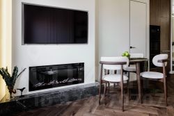 13 электрический камин в гостиной c пультом управления и огромный раскладывающийся диван